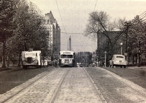 According to Andrew Young’s “St. Louis and its Streetcars,” the photo shows PCC streetcar 1620 heading south on Grand Avenue near the St. Louis University Hospital in the spring of 1942.