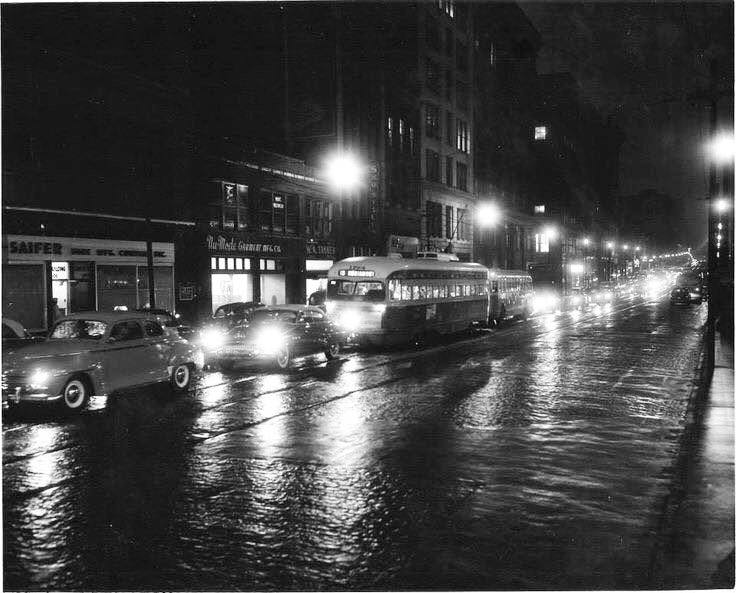 Isn’t it this a neat view of St. Louis after nightfall? A streetcar travels eastbound on the 1300 block of Washington Avenue in 1950, passing by the Tober-Saifer Shoe Company. The buildings you can make out through the dark now house the Knickerbocker and Grace Lofts and Flannery’s Irish Pub.